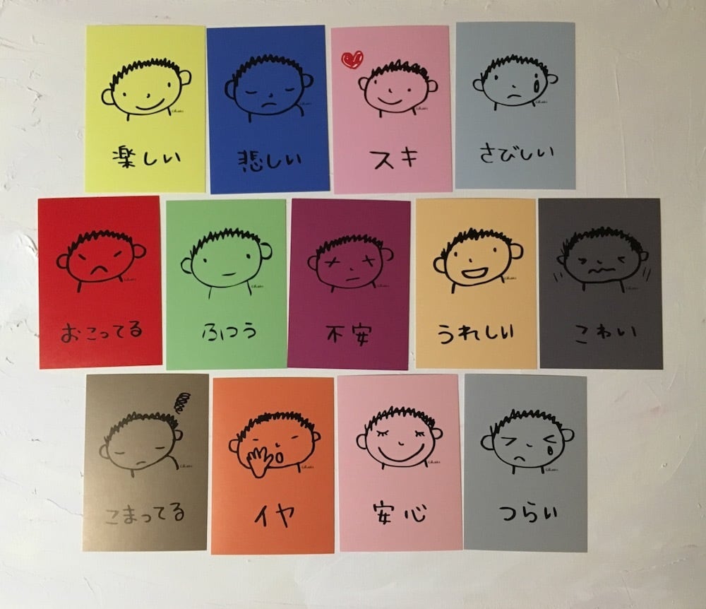 A7サイズのカード13枚+使い方のヒントつき。色鮮やかでシンプルなカードで、使い勝手がよいです。「今日はどんなきもち?」とコミュニケーションに使えます。